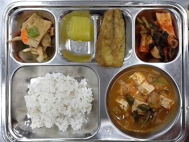 중식: 찰보리밥, 청국장지개, 어묵볶음, 고등어카레구이, 총각김치, 골드키위푸딩
