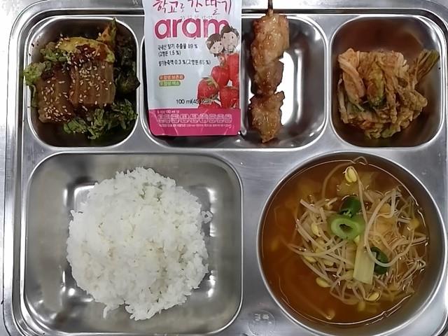 석식: 쌀밥, 김치콩나물국, 도토리묵상추무침, 닭꼬치/마늘간장소스, 배추김치, 딸기주스