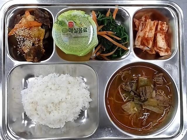 중식: 현미찹쌀밥, 한우육개장, 시금치무침, 순대야채볶음, 배추김치, 자일로스매실