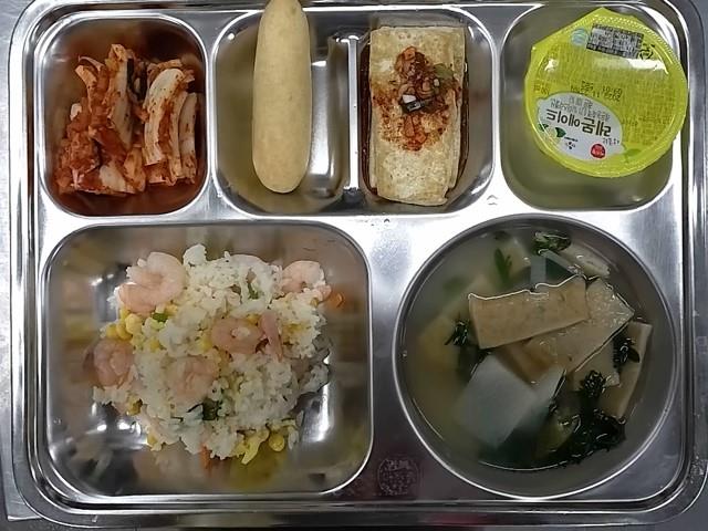 석식: 새우살계란볶음밥, 쑥갓어묵국, 두부구이양념조림, 배추김치, 레몬에이드, 롤링핫도그