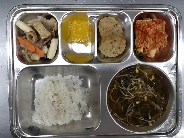 석식: 발아현미밥, 쇠고기콩나물국, 궁중떡볶이, 깻잎미니스테이크, 배추김치, 감귤푸딩