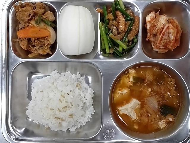 중식: 귀리밥, 순두부김치찌개, 마늘쫑건새우볶음, 돈육두루치기, 배추김치, 참외(성주)
