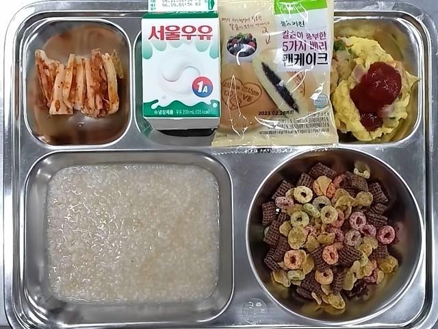 조식: 누룽지, 햄스크램블에그/케찹, 배추김치, 시리얼+우유, 5가지베리팬케이크