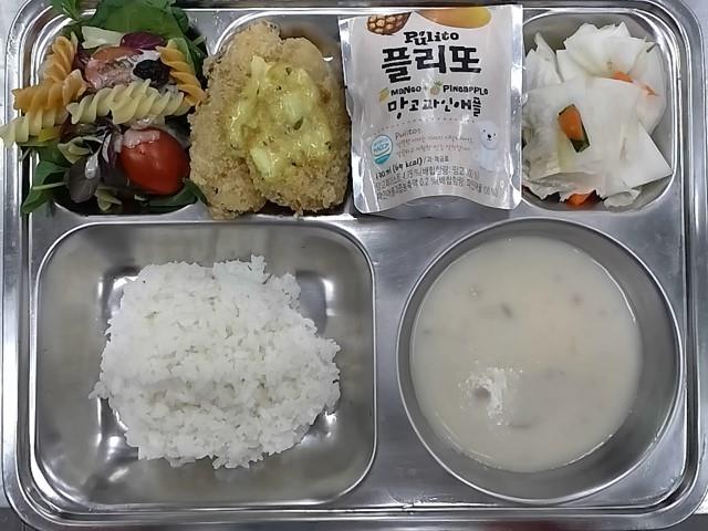 중식: 쌀밥, 양송이스프, 생선가스, 시금치푸실리후르츠샐러드, 백김치, 망고파인애플주스