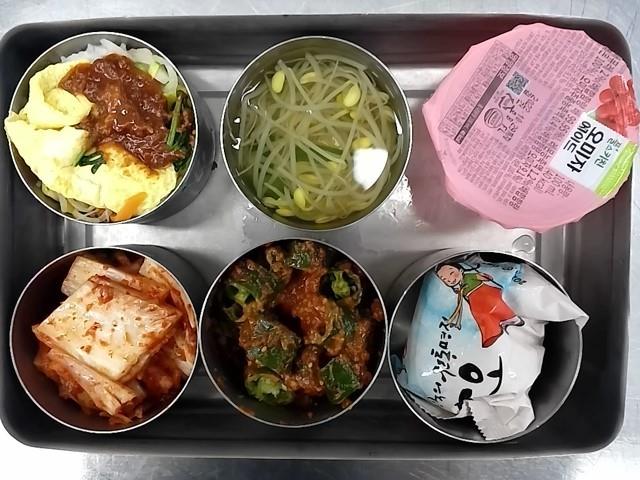 중식: 전주비빔밥/달걀지단, 약고추장, 맑은콩나물국, 아삭이고추된장무침, 배추김치, 딸기아이스찰떡, 오미자에이드