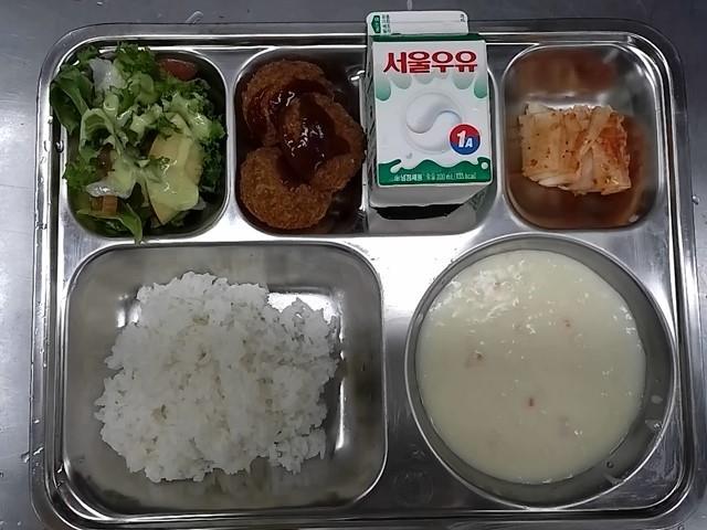조식: 쌀밥, 크림스프, 치커리사과샐러드, 바삭퀸카츠, 배추김치, 우유