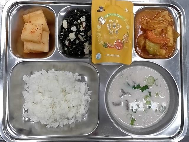 석식: 쌀밥, 설렁탕, 닭갈비볶음, 아몬드파래자반, 석박지, 유기농오렌지주스