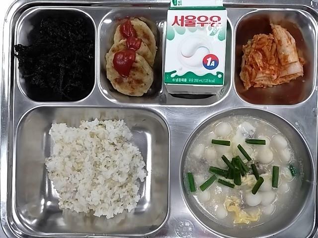 조식: 찰보리밥, 조랑떡국, 건파래볶음, 동그라땡, 배추김치, 우유