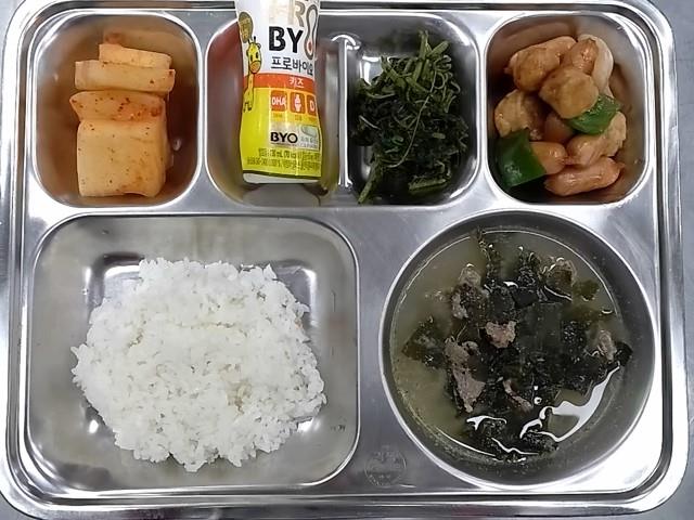석식: 쌀밥, 들깨소고기미역국, 비엔나미트볼조림, 비름나물고추장무침, 석박지, 요구르트