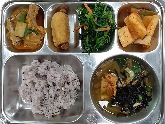 중식: 혼합잡곡밥, 도토리묵국, 돈등갈비김치찜, 비름나물무침, 석박지, 롤링핫도그