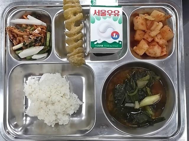 조식: 쌀밥, 아욱된장국, 무말랭이무침, 깍두기, 우유, 회오리감자(허니버터맛)
