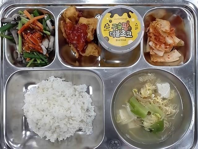 중식: 현미찹쌀밥, 콩나물북어국, 느타리버섯숙회, 닭강정, 배추김치, 구슬팡더블초코아이스크림