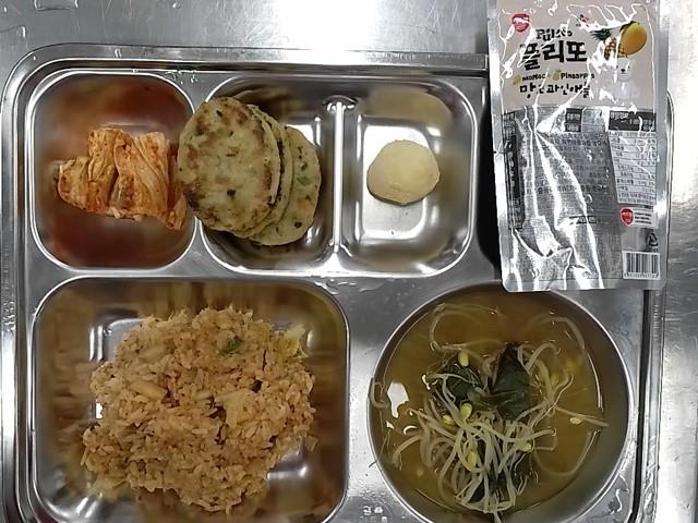 석식: 참치김치볶음밥, 근대콩나물된장국, 육원전, 배추김치, 망고파인애플주스