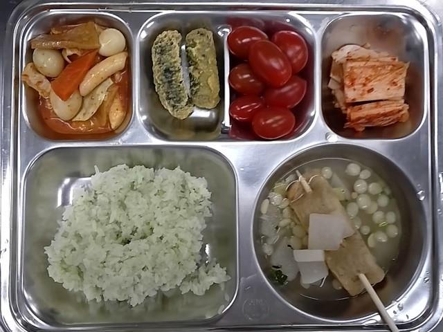 중식: 클로렐라밥, 꼬치어묵국, 국물떡볶이, 김말이튀김, 배추김치, 방울토마토