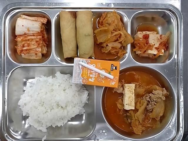 석식: 쌀밥, 돈육김치찌개, 두부구이무침, 볶은김치, 야채춘권, 오렌지주스