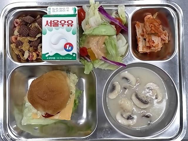 조식: 양송이스프, 미니햄버거, 양상추샐러드, 배추김치, 시리얼+우유