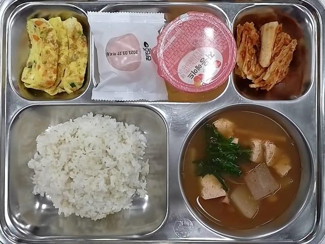 석식: 쌀밥, 오징어무국, 햄계란말이, 배추김치, 딸기아이스찰떡, 레드자몽에이드