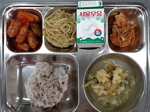 조식: 오색미밥, 감자북어국, 소시지케찹볶음, 진마채볶음, 배추김치, 우유