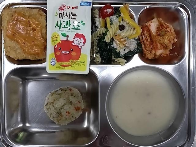 중식: 멸치주먹밥, 크림스프, 시금치푸실리샐러드, 치폴레명태생선가스, 배추김치, 마시는 사과쵸