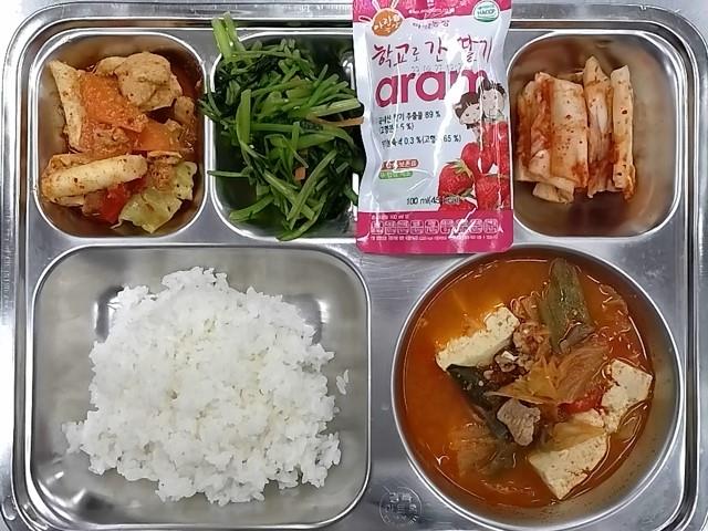 석식: 쌀밥, 돈육김치찌개, 참나물무침, 닭갈비볶음, 배추김치, 딸기주스