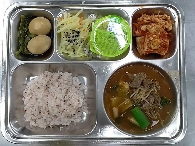 석식: 차수수밥, 한우육개장, 계란장조림, 감자채볶음, 배추김치, 청포도푸딩