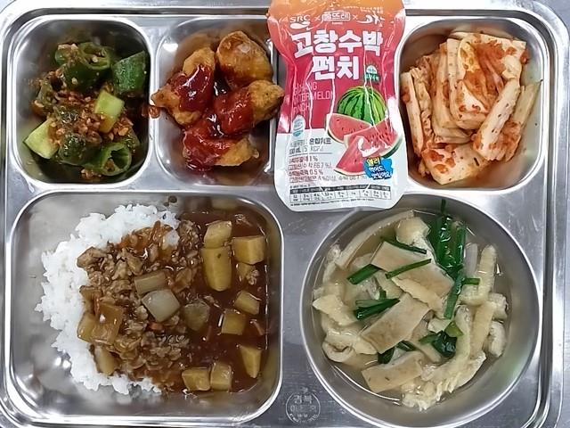 중식: 하이라이스, 유부어묵국, 아삭이고추된장무침, 양념치킨, 배추김치, 수박주스