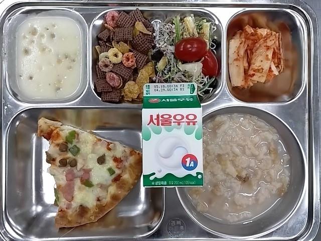 1. 조식: 시금치푸실리후르츠샐러드, 배추김치, 누룽지, 쇠고기스프, 콤비네이션피자, 시리얼+우유