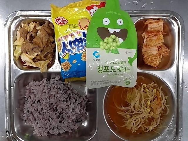 3. 석식: 찰흑미밥, 김치콩나물국, 돈육두루치기, 배추김치, 미니뿌셔, 청포도에이드