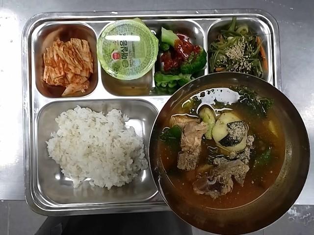중식:발아현미밥, 돈등뼈감자탕, 브로콜리/초장, 미역줄기볶음,석박지,자일로스매실