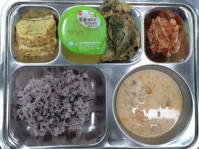 석식: 찰흑미밥, 콩비지김치찌개, 야채계란말이, 깻잎미니스테이크, 배추김치, 청귤에이드
