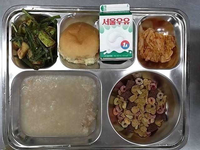 조식: 누룽지, 오이부추무침, 배추김치, 시리얼+우유, 모닝빵샌드위치