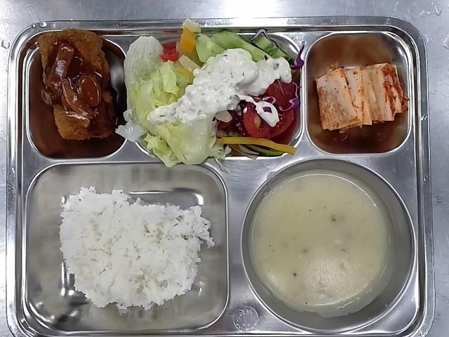 중식:쌀밥, 쇠고기크림스프, 양상추샐러드, 치즈돈가스/소스, 배추김치, 오이피클