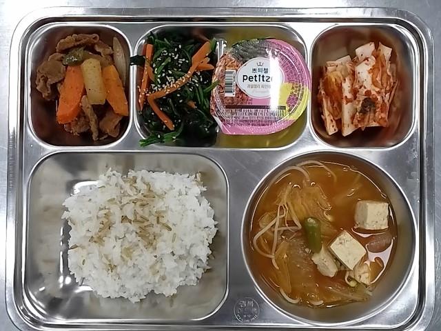 석식: 귀리밥, 두부김치국, 돈육두루치기, 배추김치, 파인애플과일젤리