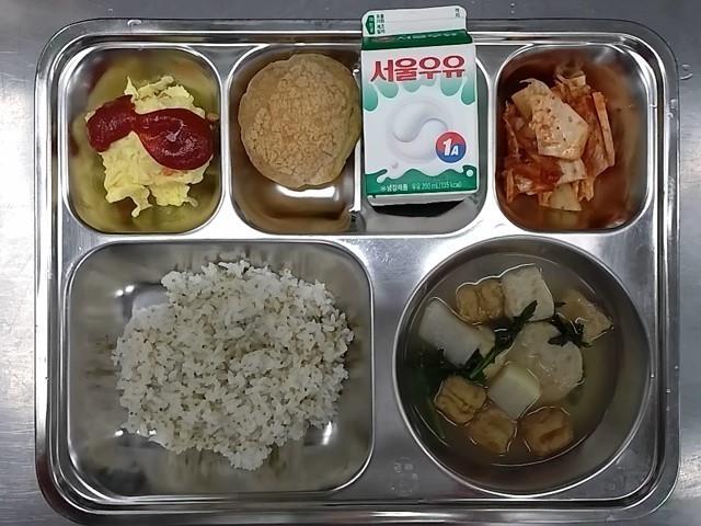 조식: 차조밥, 모둠어묵국, 스크램블에그/케찹, 배추김치, 우유, 비스켓슈