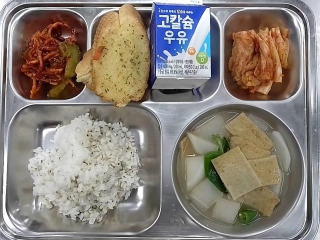 조식" 율무밥, 쑥갓어묵국, 오이진미채무침, 배추김치, 우유, 마늘빵