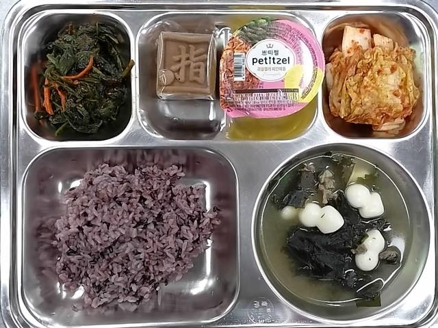 중식:찰흑미밥, 미역조랑떡국, 시금치고추장무침, 배추김치, 직지빵, 파인애플과일젤리