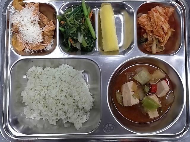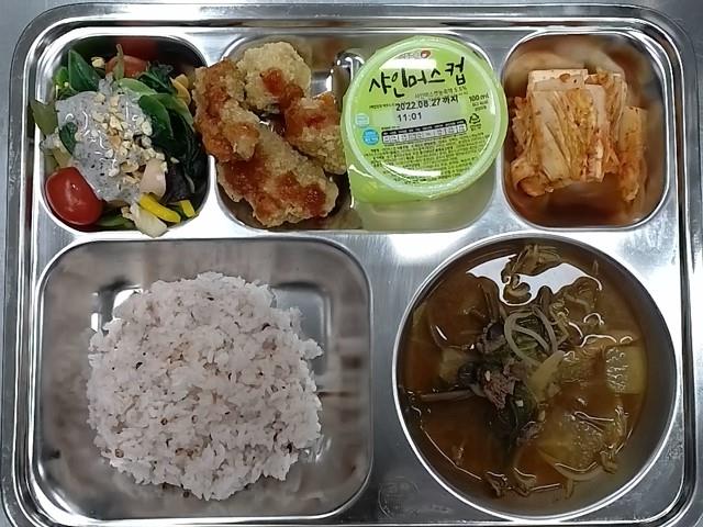 석식: 차수수밥, 육개장, 시금치푸실리후르츠샐러드, 새콤달콤깐풍대구, 배추김치, 샤인머스컵주스