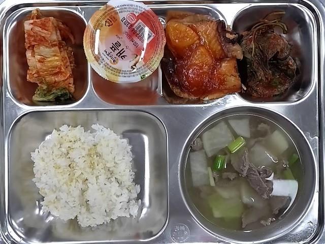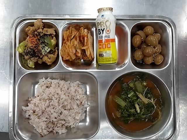중식: 차수수밥, 냉이된장국, 새송이메추리알조림, 앞다리제육볶음, 배추김치, 요구르트