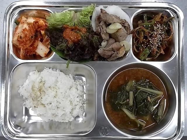 중식: 찰보리밥, 근대된장국, 부추파채무침, 돈삼겹 목살구이, 보쌈김치, 무삼/구운마늘, 상추/꺳잎/쌈장