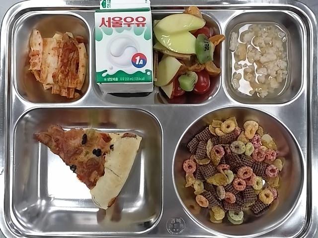 조식: 숭늉, 배추김치, 크러스트콤비피자, 시리얼/우유, 감말랭이과일샐러드