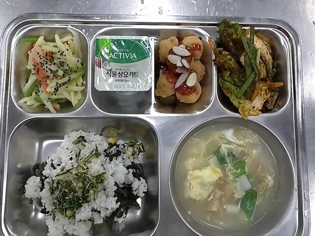 중식: 곤드레나물밥/달래장, 북어채계란국, 두부가라아게강정, 봄동겉절이, 감자야채볶음, 식물성요거트