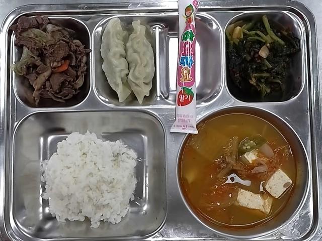 조식: 현미찹쌀밥, 참치김치찌개, 땡처만땅왕교자만두, 쇠고기버섯불고기, 열무김치, 짜요짜요