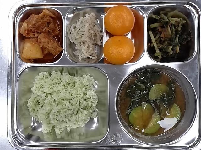 석식 : 클로렐라밥,근대된장국,등갈비김치찜,무들깨나물,열무김치,귤