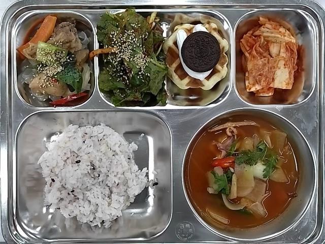 중식 : 혼합잡곡밥,오징어무국,안동찜닭,하루나겉절이,배추김치,오레오 생크림 와플
