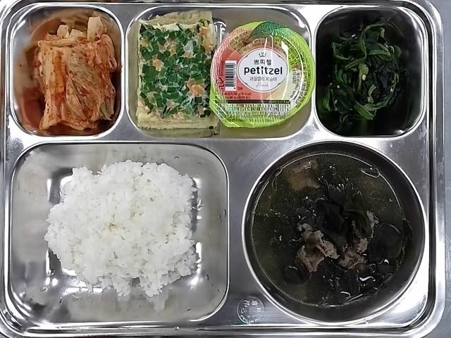조식 : 백미밥,쇠고기미역국,날치알계란찜,시금치나물,배추김치,쁘티첼 복숭아젤리