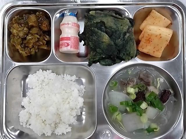 중식 : 백미밥,한우갈비탕+당면,오이지무침,해물매생이전,석박지,요구르트