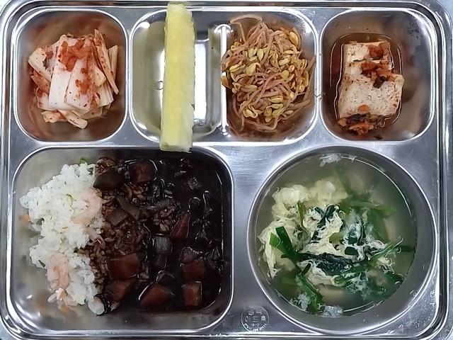 석식 : 새우볶음밥+짜장소스,계란부추국,두부양념조림,콩나물무침,배추김치,파인애플