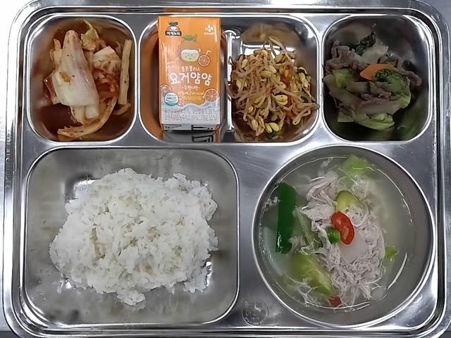조식 : 현미찹쌀밥,닭곰탕,소고기청경채볶음,콩나물무침,배추김치,요거얌얌 오렌지주스
