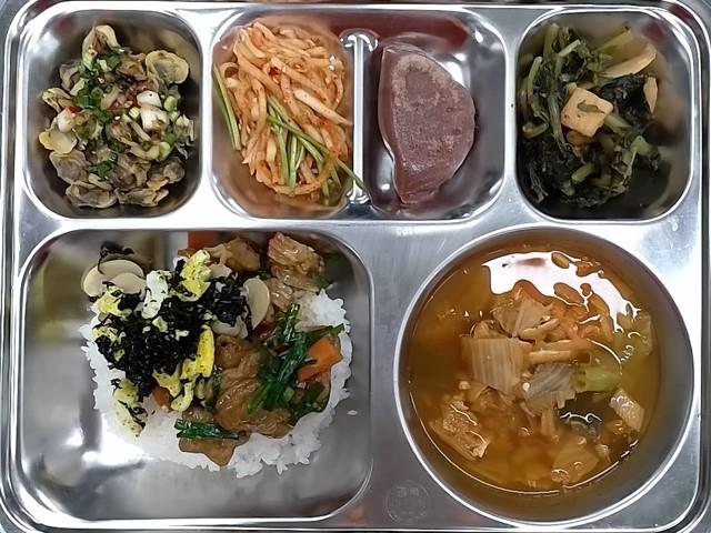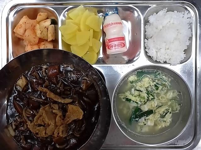 중식 : 쌀밥(추가),숯불고기짜장면,계란부추국,저염단무지,깍두기,요구르트