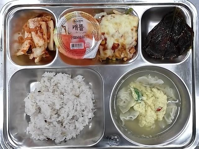 조식 : 혼합10곡밥,만두계란국,스멜치즈감자스테이크,매실생깻잎무침,배추김치,캐플주스